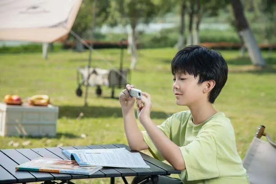 孩子在戶外使用阿爾法蛋詞典筆閱讀英文讀物(淘云科技供圖)