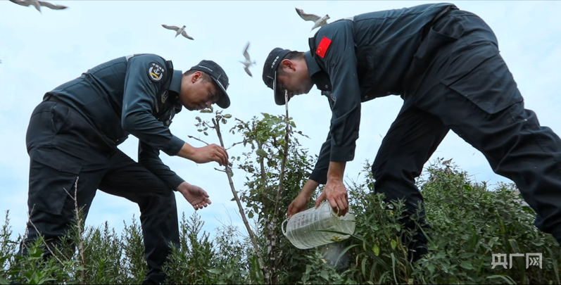 海警執(zhí)法員在海島補(bǔ)種植被(央廣網(wǎng)發(fā) 徐德全 攝)
