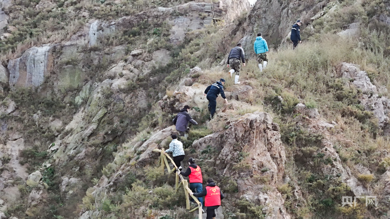 記者跟隨海警、保護(hù)區(qū)工作人員及志愿者沿山體陡壁登島(央廣網(wǎng)發(fā) 潘爍 攝)