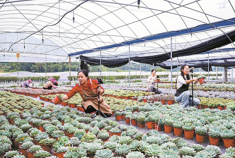 近日,寧化縣安樂多肉種植基地迎來銷售旺季。主播搶抓“雙11”到來的黃金周期,在大棚內(nèi)熱情地向直播間顧客展示、推銷各種多肉植物,一旁的村民快速有序地將售出的盆栽分類打包。