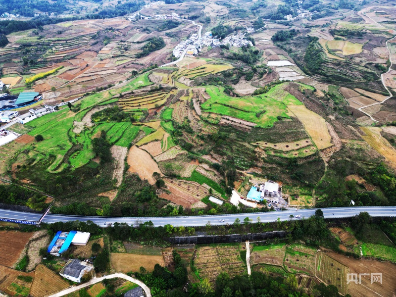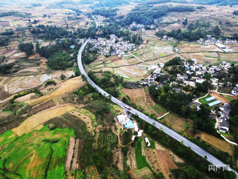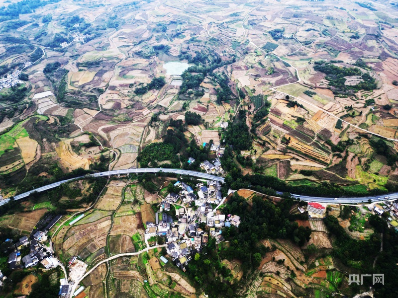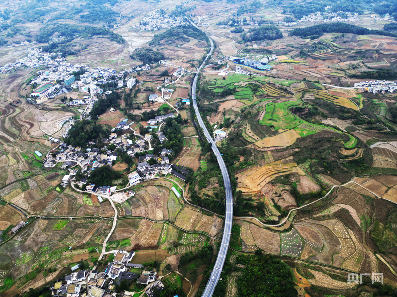 暮秋時節(jié)的黔西市錦星鎮(zhèn)新街社區(qū),青黃相間的田園與村落、公路、遠山相映成趣(央廣網發(fā) 侯進勇 攝)