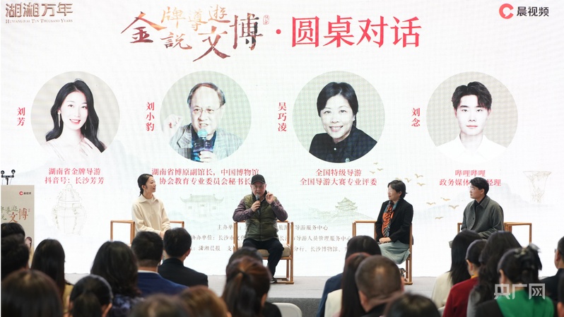 圓桌對(duì)話環(huán)節(jié)同樣亮點(diǎn)紛呈。該環(huán)節(jié)由湖南金牌導(dǎo)游劉芳主持,湖南省博物館原副館長(zhǎng)劉小豹、全國(guó)特級(jí)導(dǎo)游吳巧凌、B站平臺(tái)文博板塊負(fù)責(zé)人劉念分別就《“破圈”:新媒體時(shí)代如何講好文博故事》《“出圈”:金牌導(dǎo)游如何助力打造文博爆款》《“圈粉”:如何讓更多年輕人愛(ài)上文博》三大主題展開(kāi)深度分享,共同探索文博傳播的新路徑。