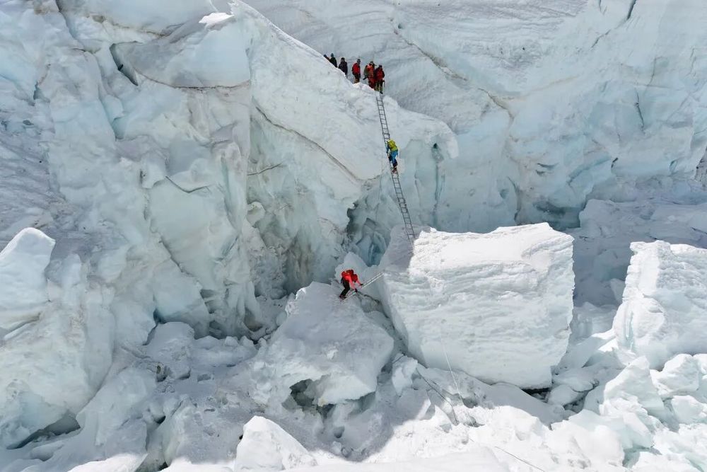 珠峰區(qū)域,徒步者通過天梯翻越山頭(央廣網(wǎng)發(fā) 圖片來源:視覺中國)