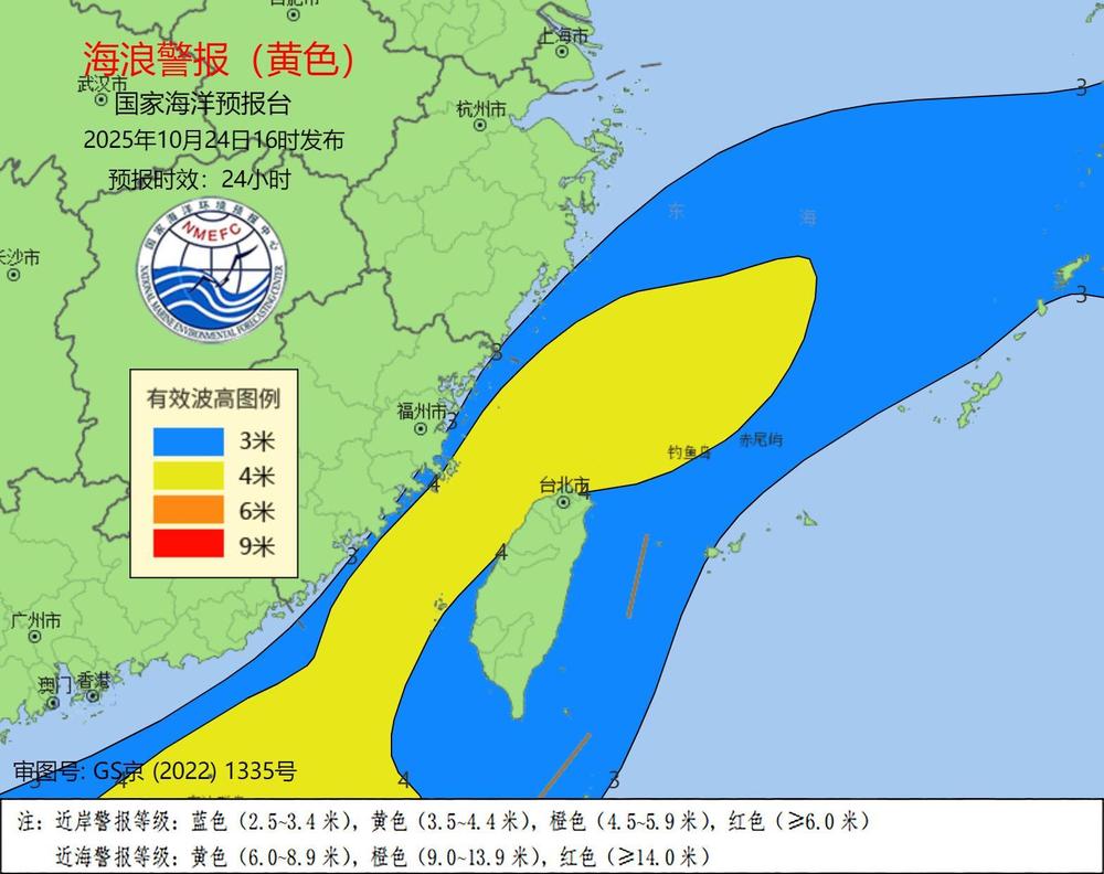受強冷空氣的影響,預計10月24日下午到25日下午,東海南部、臺灣海峽將出現(xiàn)3米到5米的大浪到巨浪;福建近岸海域?qū)⒊霈F(xiàn)2.5米到3.8米的大浪,該近岸海域海浪預警級別為黃色,浙江南部近岸海域?qū)⒊霈F(xiàn)2米到3米的中浪到大浪,該近岸海域海浪預警級別為藍色。