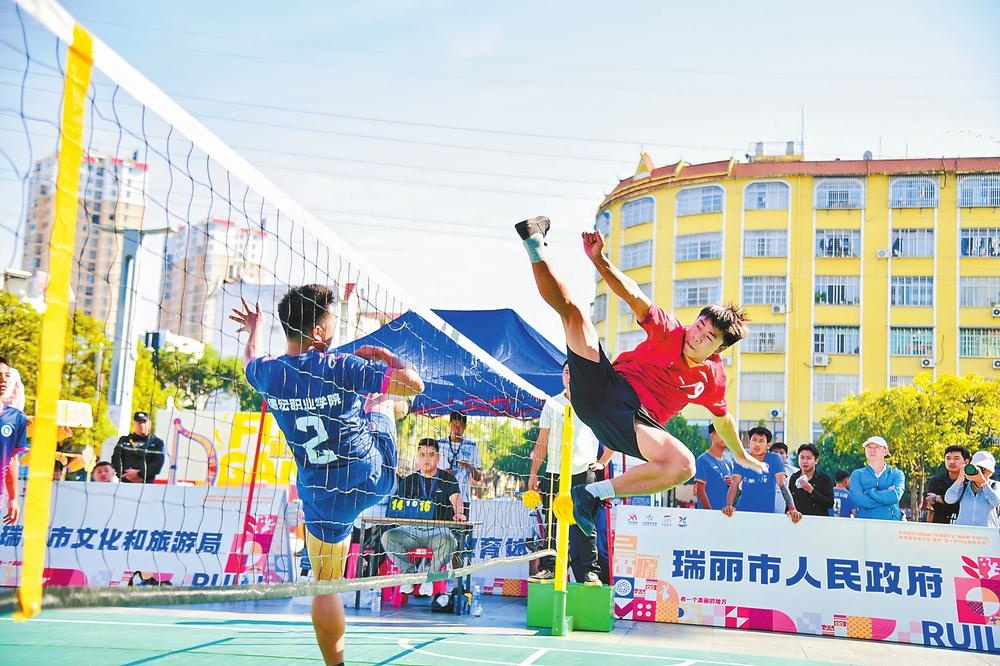今年的嘉年華以男子三人籃球賽、混合制氣排球賽、足球賽為主體,邀請(qǐng)南亞東南亞球隊(duì)參賽,嘉年華還特邀老撾、緬甸等國(guó)家駐昆外交官出席開幕式,并體驗(yàn)少數(shù)民族傳統(tǒng)體育項(xiàng)目。瑞麗市則承辦了邊境少數(shù)民族傳統(tǒng)體育邀請(qǐng)賽,藤球、民族健身操兩項(xiàng)比賽,吸引了150多名運(yùn)動(dòng)員參加,傣族丟沙包、扭棍、篾彈弓等6個(gè)獨(dú)具德宏特色的民族體育活動(dòng)在弄莫湖體育公園進(jìn)行展示和體驗(yàn)。